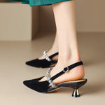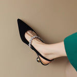 Fă un pas spre eleganță cu pantofii noștri cu toc mic și vârf ascuțit, care dispun de un impresionant brâu de strass ce adaugă o notă de glamour rafinat. Concepuți cu o talpă căptușită pentru confort sporit pe tot parcursul zilei, acești tocuri sunt perfecți pentru orice ocazie de primăvară sau vară.