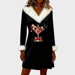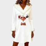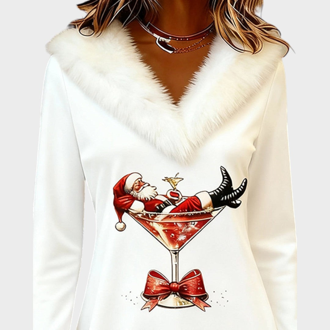 Rochia de seară de Crăciun combină farmecul festiv cu o notă jucăușă și elegantă. Cu detaliile sale clasice de păr roșu și alb la decolteu și la manșete, creează instantaneu un look confortabil plin de spiritul Crăciunului. Evidentiază ilustrația adorabilă a lui Moș Crăciun relaxându-se într-un pahar de cocktail: un detaliu ireverențios care transformă rochia într-o piesă unică și plină de personalitate.
