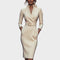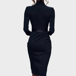 Această rochie elegantă se distinge prin decolteul sofisticat înfășurat, mânecile trei sferturi și o siluetă rafinată. Un brâu structurat cu cataramă pătrată subliniază talia, în timp ce designul ajustat se conturează perfect pe curbele naturale, oferind linii curate și suave.