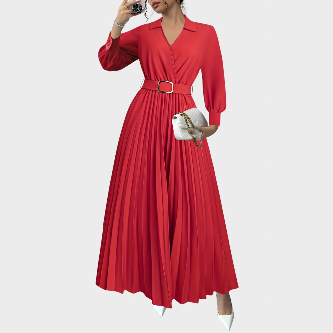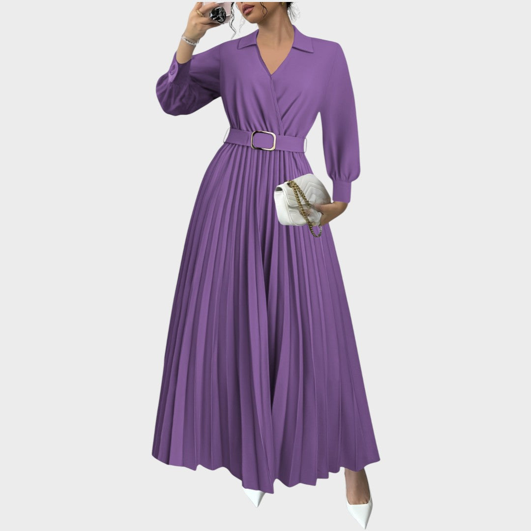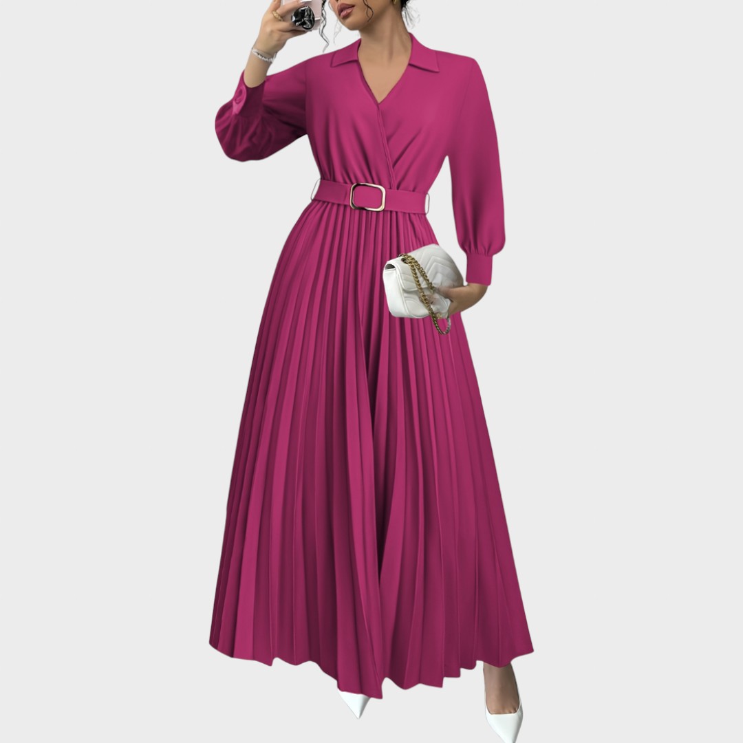 Rochia Margot combină eleganța cu confortul, având un decolteu în V flatant și mâneci lungi cu mansete, perfect pentru un look rafinat. Talie ajustată cu un brâu asortat și detaliu cu cataramă aurie subliniază silueta, în timp ce fusta lungă plisată adaugă mișcare și eleganță.