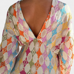 Rochia Shanice este colorată, envolvătoare și plină de personalitate. Confecționată dintr-o țesătură geometrică, această rochie aduce un aer artistic și sofisticat cu o siluetă largă și fluidă.
