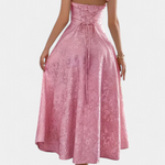 Strălucește cu stil în fiecare ocazie cu rochia Gilda, o combinație perfectă între luxul jacquard-ului și femininitatea siluetei.
