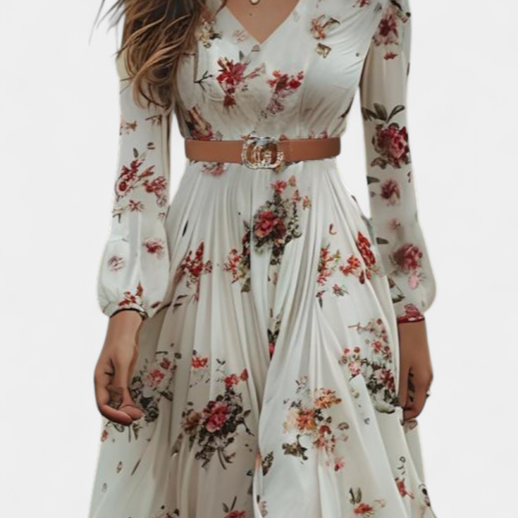 Rochie Maxi Florală Amanda cu Decolteu în V și Mâneci Lungi