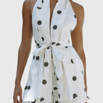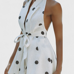 Un set de vară care combină farmecul retro cu sofisticarea relaxată. Eshra se remarcă prin imprimeul cu puncte negre pe fundal ivoriu, creat pentru a străluci sub soare cu o siluetă ușoară și favorabilă. Topul halter cu decolteu adânc și spate descoperit se ajustează la talie cu un brâu moale în ton, în timp ce șorturile cu talie înaltă și brâu cu inel metalic completează look-ul cu un stil definit.