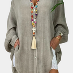 Cămașa Oversized Melis este adăugarea perfectă în garderoba ta de vară. Fabricată din bumbac ușor, poate fi purtată și ca rochie de plajă și ca un cover-up pentru costumul de baie. Croiala sa lejeră este confortabilă și elegantă, făcând-o alegerea ideală pentru o zi la plajă. Rămâi răcoroasă și elegantă cu Cămașa Oversized Melis.