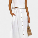 Un set versatil de inspirație minimalistă care respiră prospețime, confort și stil casual. Textura sa ușoară din bumbac, designul fluid și butoanele decorative îl fac alegerea perfectă pentru zile relaxante sau escapade urbane cu farmec natural.