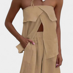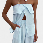 Un look puternic cu o atitudine de vară. Oriana combină un top tip bandeau cu o fustă lungă cu deschidere laterală, creând o siluetă elegantă și încrezătoare. Designul minimalist evidențiază subtil figura, ideal pentru cei care doresc să iasă în evidență fără efort. O opțiune versatilă care funcționează atât pentru o cină lângă mare, cât și pentru o după-amiază în oraș.